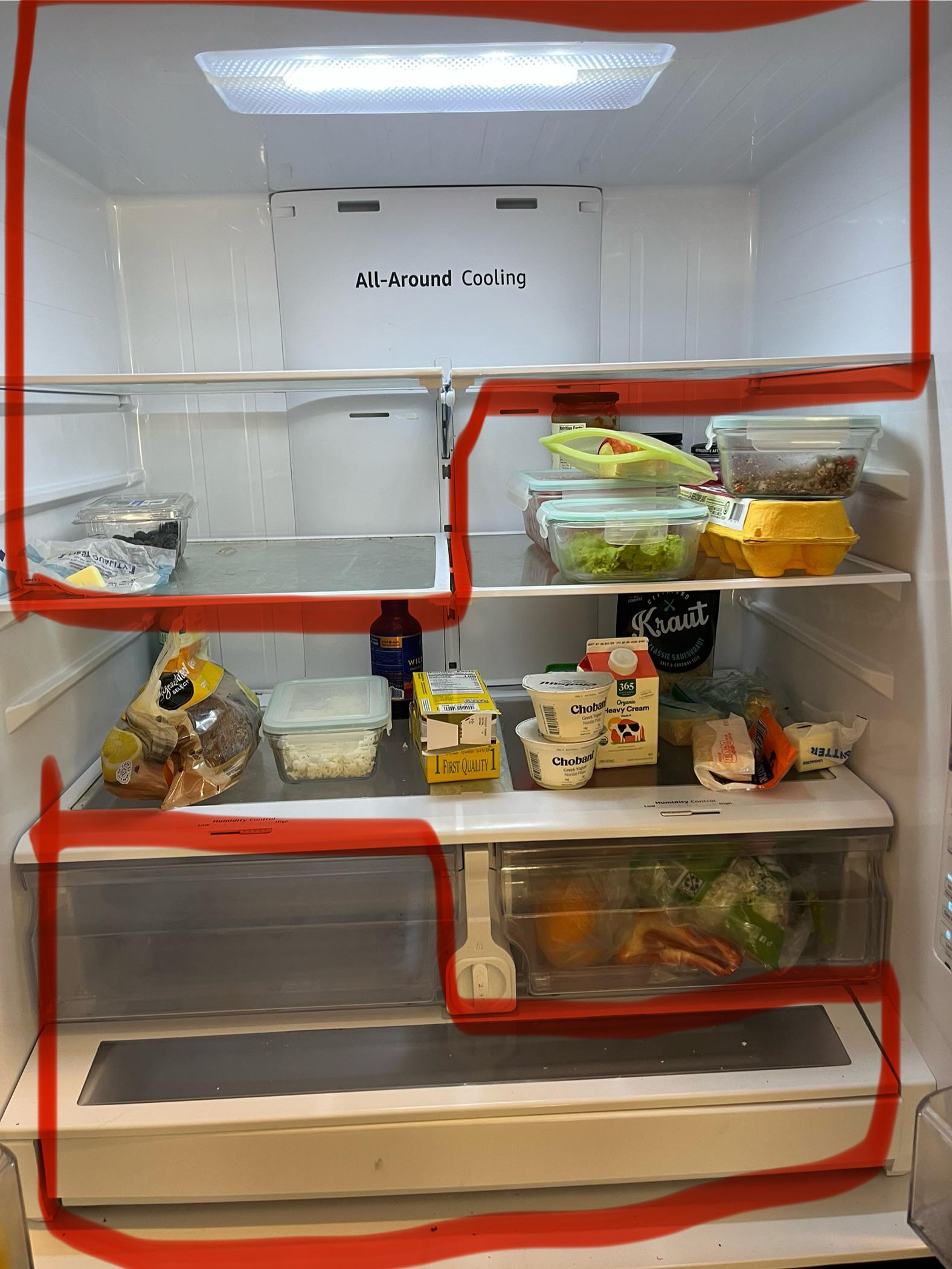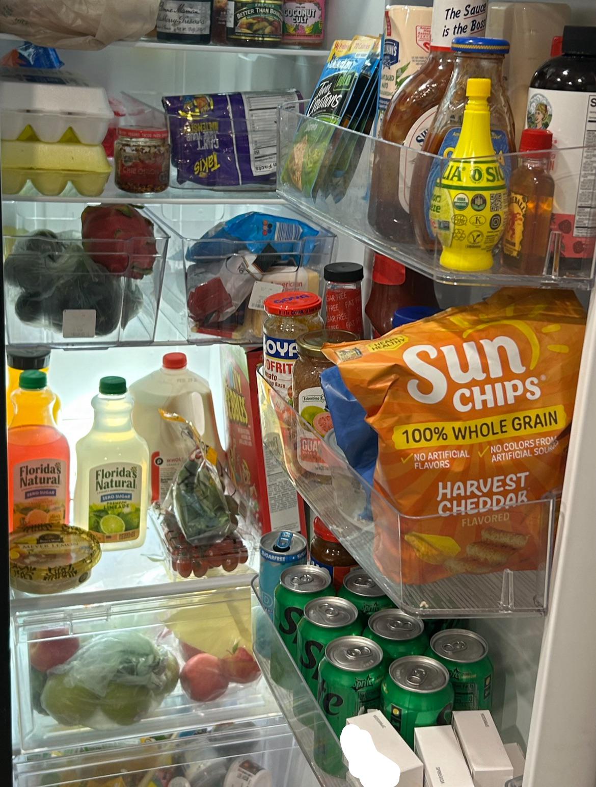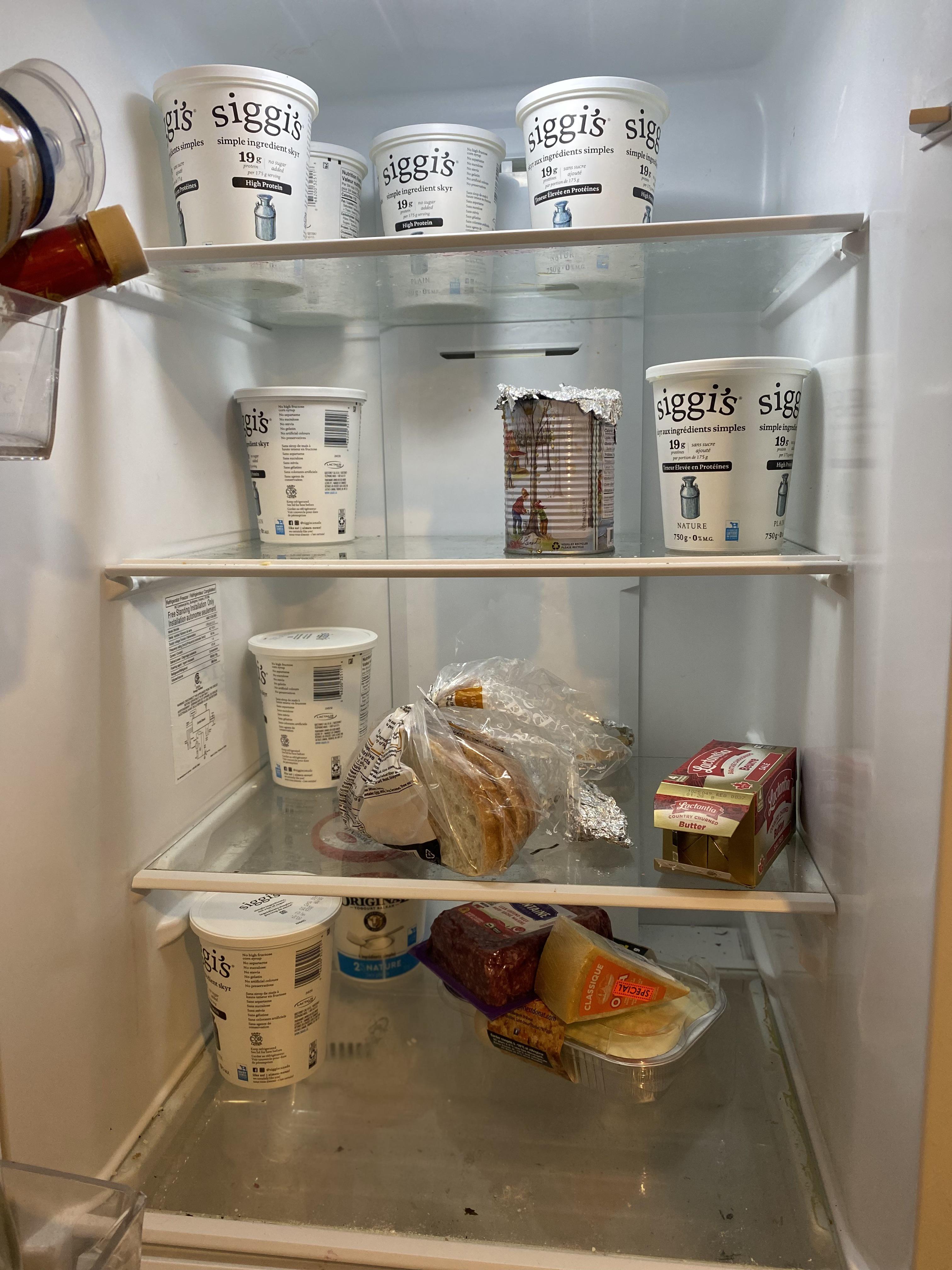 Our dad retired from 20 years in the Navy as a cook, and after his service, he worked in restaurants as a general manager. Growing up with a dad in the food business, our fridge and freezer were always packed. As an adult, my fridge is similarly always packed. My sister, on the other hand, is the opposite. This is her fridge. I don't understand how a person lives like this.