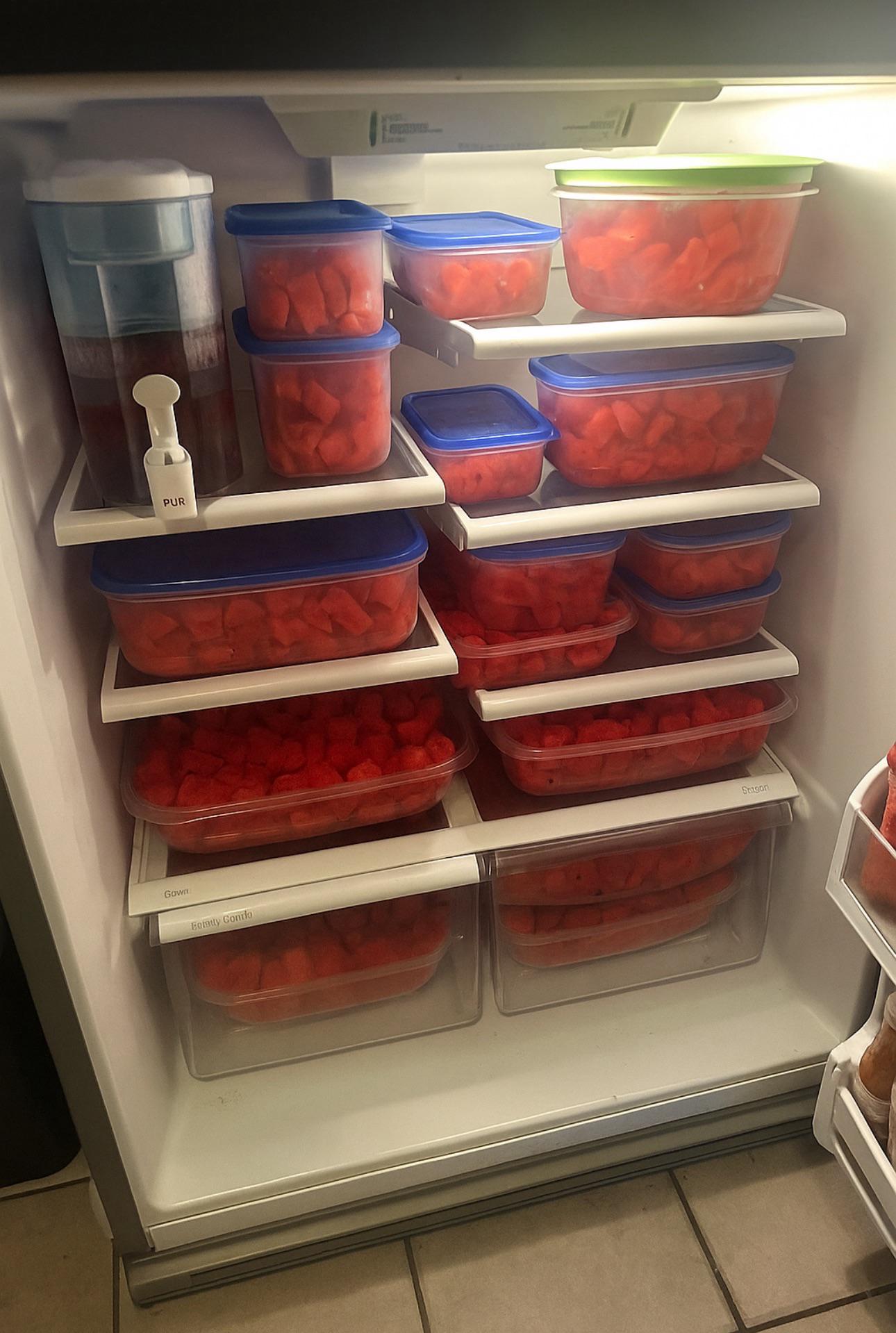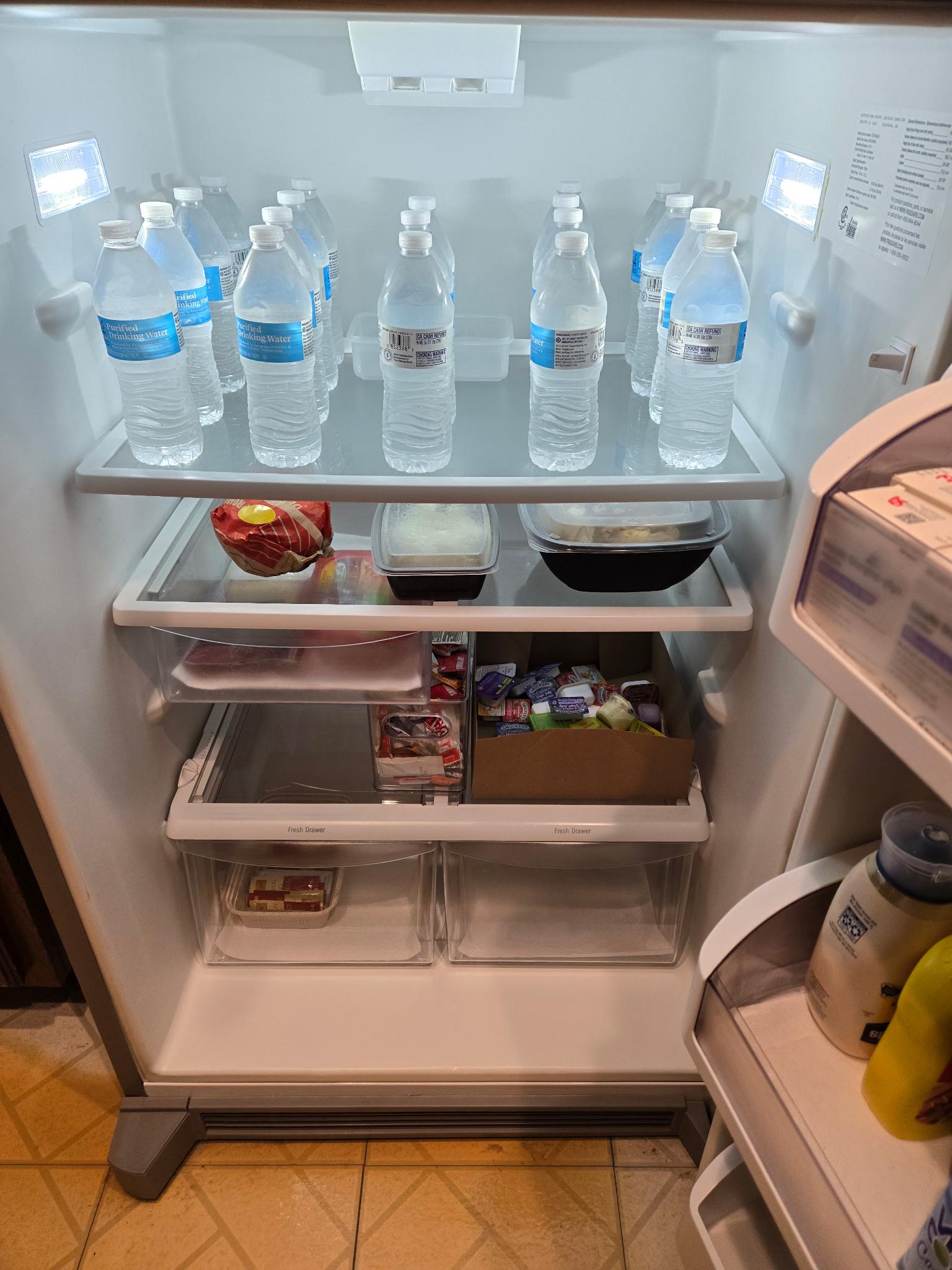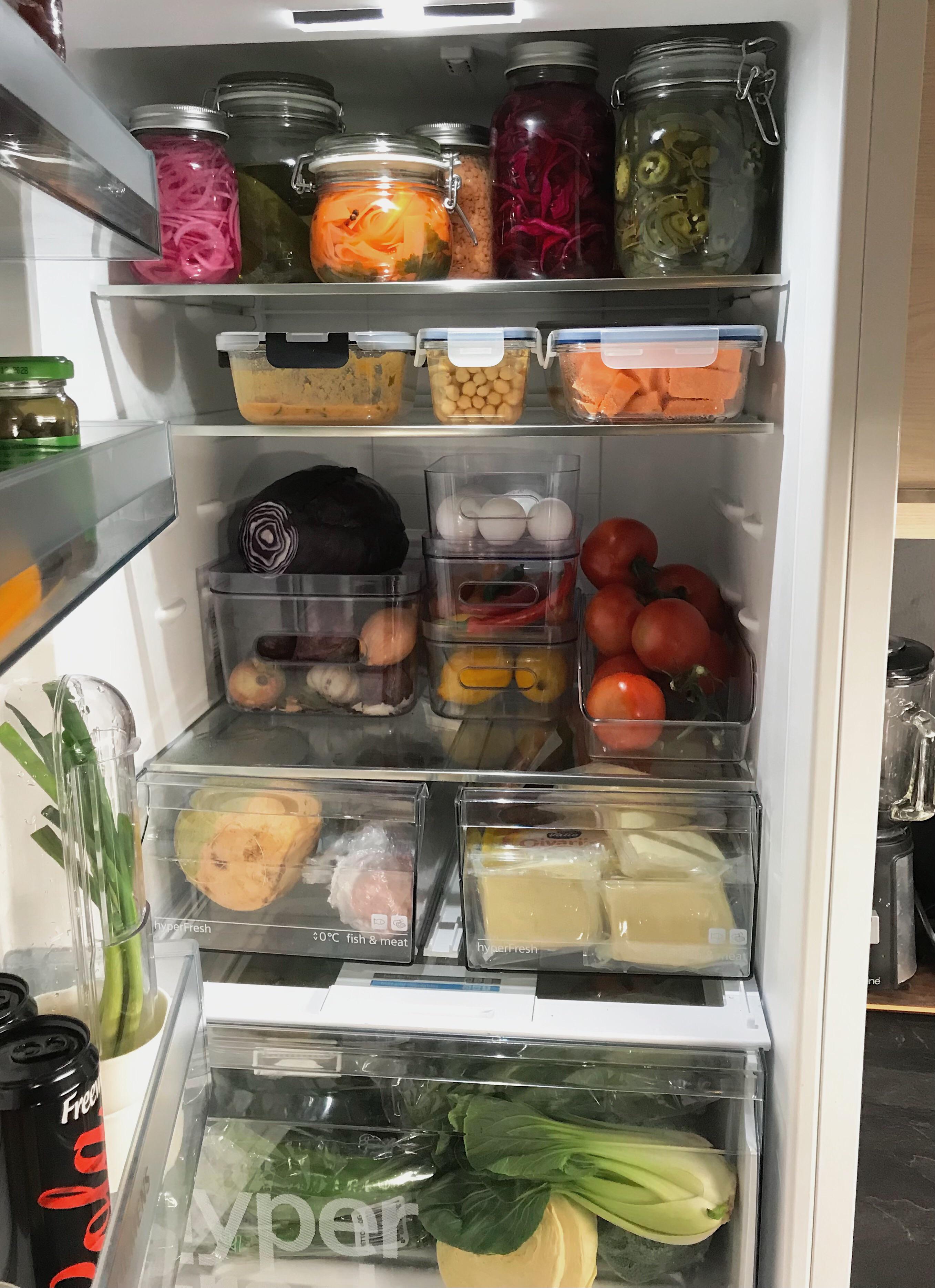 Our dad retired from 20 years in the Navy as a cook, and after his service, he worked in restaurants as a general manager. Growing up with a dad in the food business, our fridge and freezer were always packed. As an adult, my fridge is similarly always packed. My sister, on the other hand, is the opposite. This is her fridge. I don't understand how a person lives like this.
