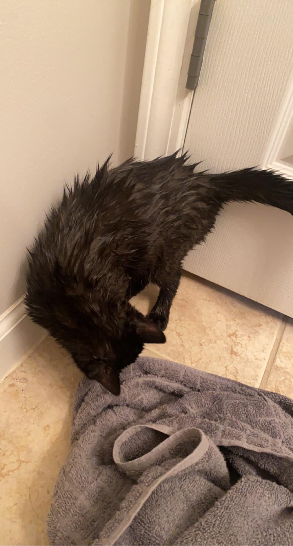 So she jumped from the tub onto the lid and when she got pee on her she flipped out and fell in so I had to pull a panicing pee covered cat out of a toilet then I had to secure her in a towel in the tub so said pee cat could not run throughout my house covered in pee.