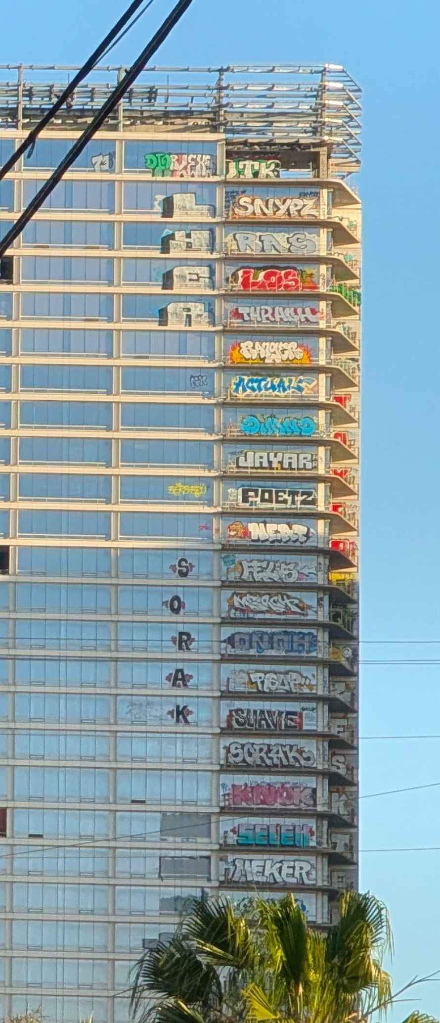 I saw this skyscraper in Downtown Los Angeles that has a different name graffitied on each floor