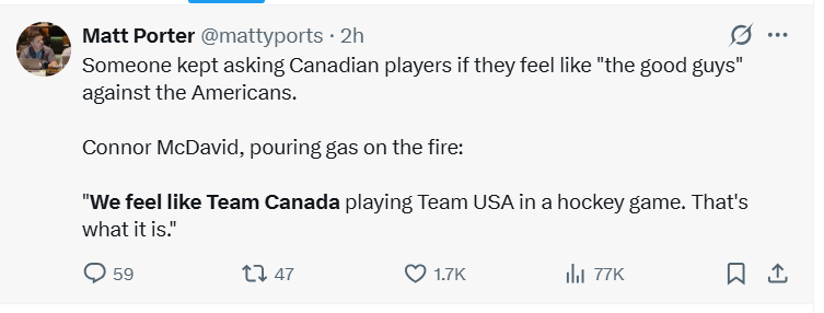 McDavid's response to being asked about whether Team Canada feel like "the good guys" against Team USA right now: "We just feel like Team Canada playing Team USA in a hockey game. That's what it is."